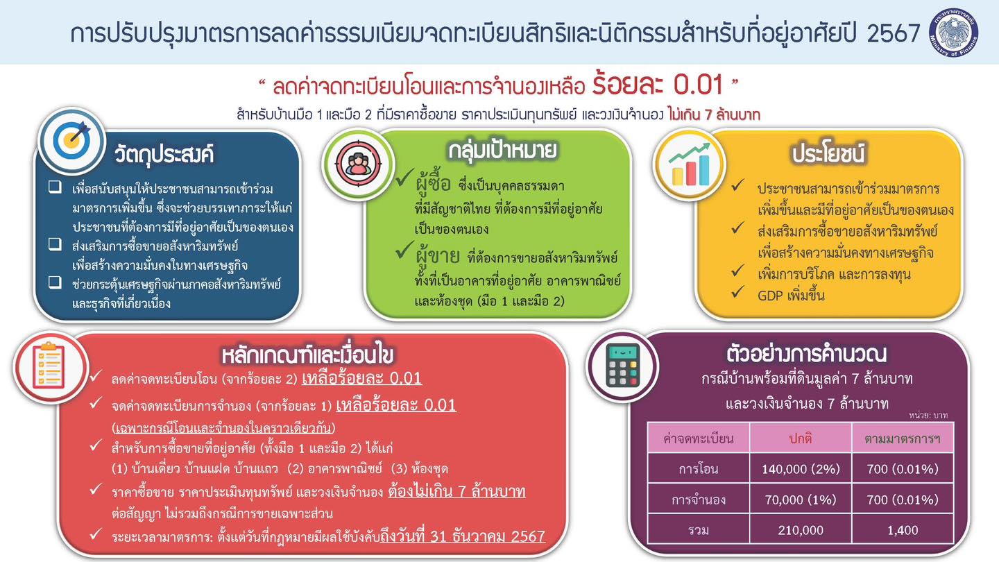 กรมที่ดิน ลดค่าธรรมเนียมโอน - จำนอง เหลือ 0.01 % สำหรับบ้าน – คอนโด ราคาไม่เกิน 7 ล้านบาท
